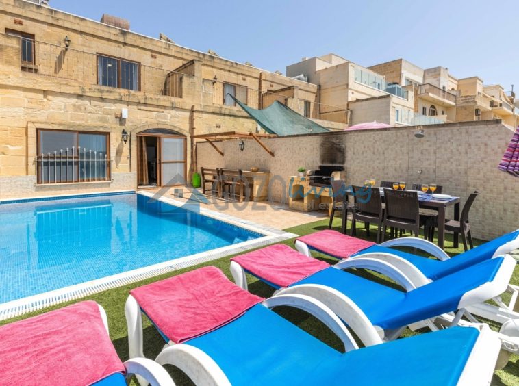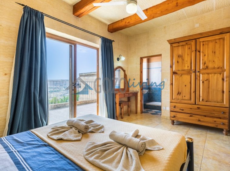 A fully air-conditioned farmhouse, located in the village of Xaghra and enjoys spectacular country and sea views. At ground floor level one may find a triple bedroom en-suite with shower room, a spare shower room, a fully equipped kitchen/dining and sitting room with smart T.V, and a barbeque area. Accessed through a marble staircase, the first floor comprises of two main bedrooms, both en-suite with shower or bathroom. One of the bedrooms enjoys a terrace overlooking beautiful country views.
