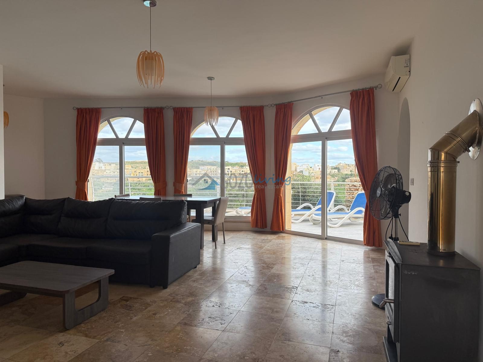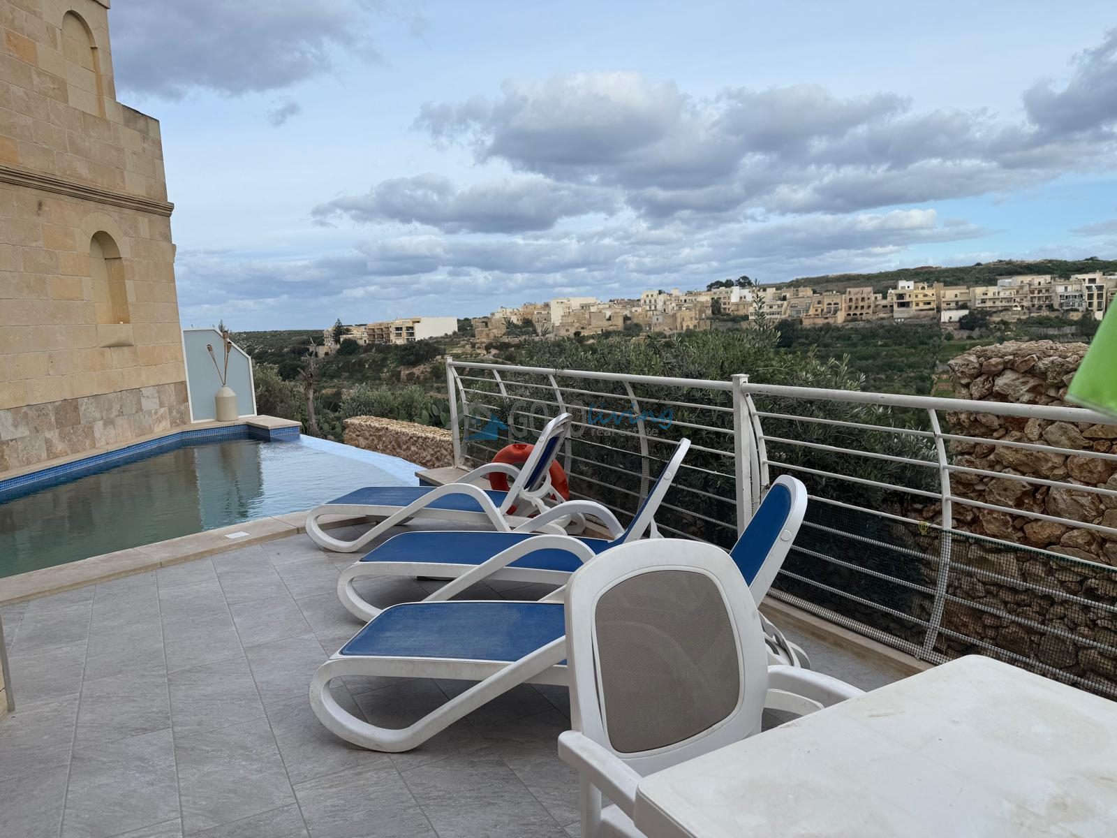 Cliff-edge house available for long let on the outskirts of Nadur. This spacious home features three bedrooms, each with its own ensuite bathroom, as well as a main bathroom for added convenience. The open-plan living and dining area, together with a separate kitchen, all overlook the pool, deck area, and beautiful valley views. A one-car garage further complements this exceptional property. The property is fully air-conditioned. Pet friendly.